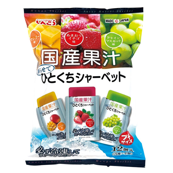 ※下のサムネイルに触れると上の画像が切り替わります 国産果汁ひとくちシャーベット12個入 品番:MT1837028 食べやすいスティックタイプ。国産果汁使用のシャーベット。 参考上代 ¥300 販売価格 ¥278 (税込¥300.24) ※軽減税率対象商品 注文する見積り依頼する ※64個単位でお願いします。 この商品について問い合わせる 商品検索を続ける 商品サイズ 外装サイズ 215×155×40mm 材質 名入れサイズ ケース入数 16 内容 ●内容量:18g×12袋(あまおういちご・シャインマスカット・マンゴー×各4) ●賞味期間:製造日より582日 ●包装袋入り ※お支払いは銀行振込でお願いいたします。 お見積り依頼フォーム 商品名 国産果汁ひとくちシャーベット12個入 品番 MT1837028 数量 64個単位でお願いします。 名入れ する しない 名入れとは… 名入れ色 指定なし 赤 黒 白 黄 青 紺 緑 黄緑 ピンク オレンジ 指定色 名入れ書体 指定なし 明朝体 正楷書体 ゴシック体 丸ゴシック体 行書体 教科書体 角ポップ体 プレゼンス書体 指定ロゴ ※書体サンプル画面 包装 する しない のし巻き する しない 包装紙 包装紙の柄を大きな画像で確認 お届け先 1箇所 2箇所以上 お支払い 銀行振込のみとなります 銀行振込 代金引換 希望納期 2026 2027 2028 年 01 02 03 04 05 06 07 08 09 10 11 12 月 01 02 03 04 05 06 07 08 09 10 11 12 13 14 15 16 17 18 19 20 21 22 23 24 25 26 27 28 29 30 日 以前お見積り依頼・ご注文された際にパスワードを設定された方は、こちらにご入力ください。お客様情報を入力する手間が省けます。 メールアドレス: パスワード: パスワードを忘れた方はこちら 顧客情報呼び出し 氏名 氏 名 会社名 郵便番号 半角数字:住所自動検索 住所 都道府県 選択してください 北海道 青森県 岩手県 宮城県 秋田県 山形県 福島県 茨城県 栃木県 群馬県 埼玉県 千葉県 東京都 神奈川県 新潟県 富山県 石川県 福井県 山梨県 長野県 岐阜県 静岡県 愛知県 三重県 滋賀県 京都府 大阪府 兵庫県 奈良県 和歌山県 鳥取県 島根県 岡山県 広島県 山口県 徳島県 香川県 愛媛県 高知県 福岡県 佐賀県 長崎県 熊本県 大分県 宮崎県 鹿児島県 沖縄県 市区町村 町名 番地 電話番号 例:0000-00-0000 FAX番号 例:0000-00-0000 メールアドレス 携帯アドレス パスワード ※パスワードを設定すれば、次回以降お客様情報の入力の手間が省けます。 お問い合わせご質問 ご注文内容確認 お見積り依頼する 関連商品 スノージュエル 1個 ¥390⇒¥278(税込¥300.24) いつもありがとう ふく穂1袋 ¥300⇒¥278(税込¥300.24) ロマネスク・ココ(パイ・紅茶) 1個 ¥390⇒¥278(税込¥300.24) テディケーキ 1個 ¥390⇒¥278(税込¥300.24) しっとりフィナンシェ ¥350⇒¥278(税込¥300.24) ひとくち安納芋ゼリー ¥300⇒¥278(税込¥300.24) 奥能登地サイダー しおサイダー飴 ¥280⇒¥279(税込¥301.32) アニマル巾着バッグ付き駄菓子パック5点セット ¥400⇒¥279(税込¥306.9) 関連カテゴリー 食品 お菓子類 関連特集 熱中症対策グッズ特集